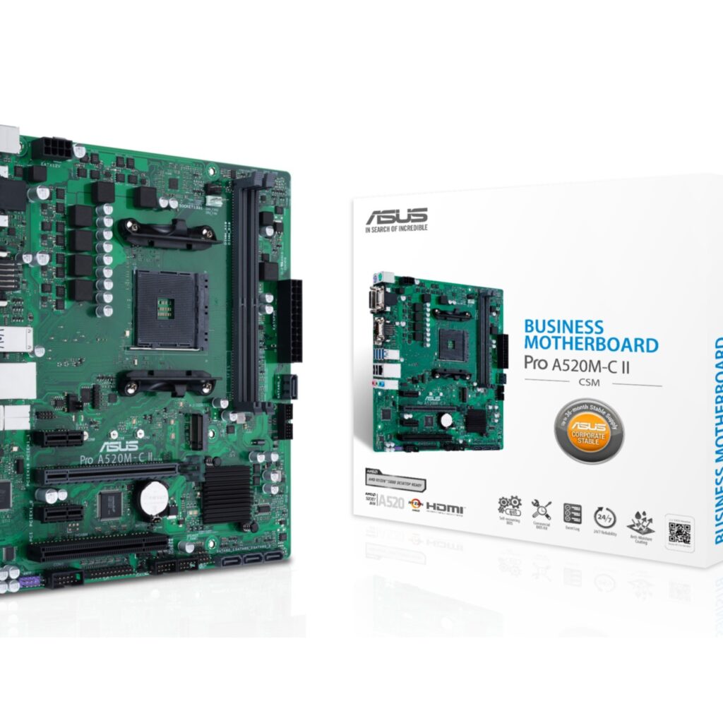 Das ASUS PRO A520M-C II/CSM (AM4) (D) von ASUS bietet zuverlaessige Mainboard-Performance mit hochwertigen Komponenten, umfangreichen Anschlussmöglichkeiten und ASUS-typischer Qualitaet. Ideal fuer Gaming- und Workstation-Systeme.