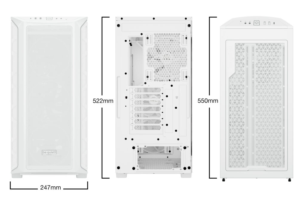 be quiet! Shadow Base 800 FX White. Formfaktor: Midi Tower, Typ: PC, Produktfarbe: Weiß. Unterstützte Stromversorgungs-Formfaktoren: ATX, PS2. Installierte Lüfter (Vorderseite): 3x 140 mm, Durchmesser unterstützte Vorderseitenlüfter: 120,140 mm, Installierte Lüfter hinten: 1x 140 mm. Unterstützte Hard-Disk Drive Größen: 2.5,3.5". Breite: 247 mm, Tiefe: 550 mm, Höhe: 522 mm