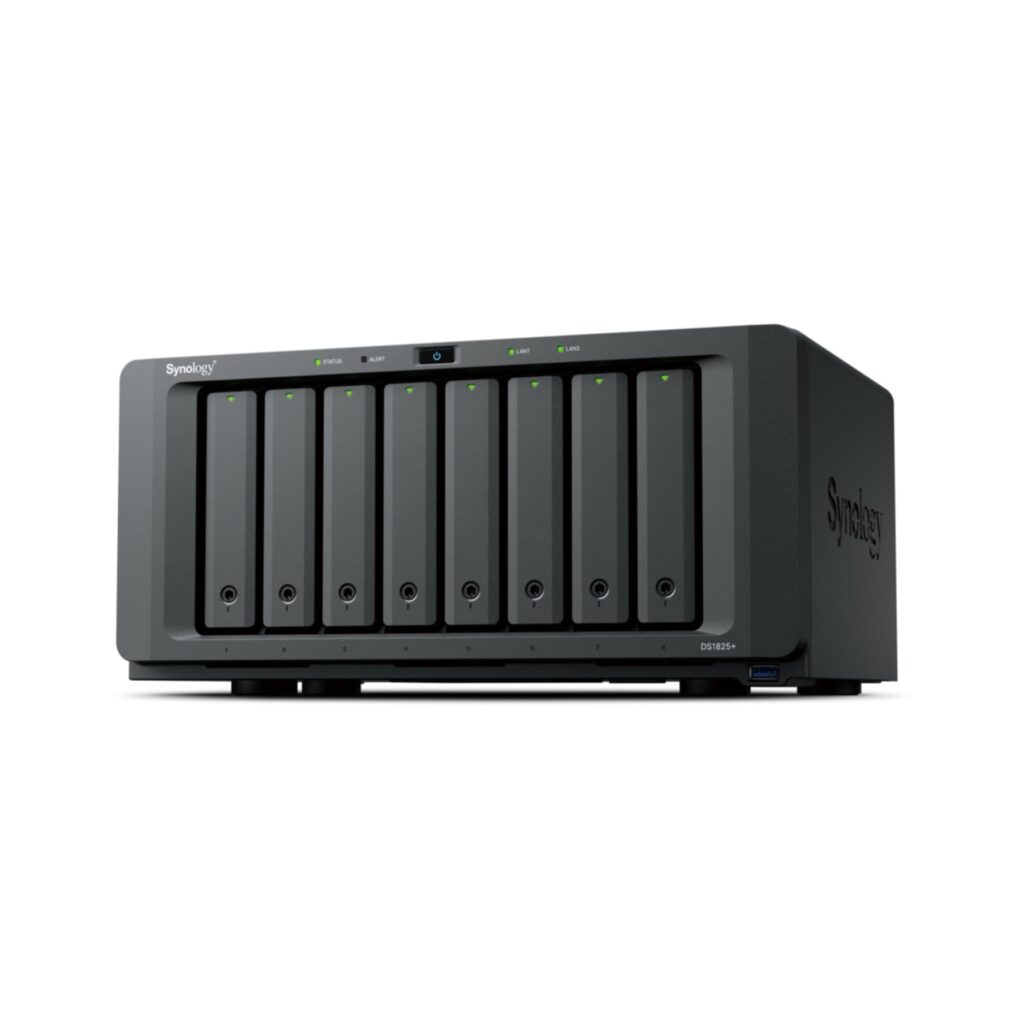 Das NAS Server Synology DiskStation DS1825+ 8-Bay von Synology ist ein leistungsstarkes Netzwerkspeichersystem fuer zentrale Datenverwaltung, Backups und Medienstreaming.